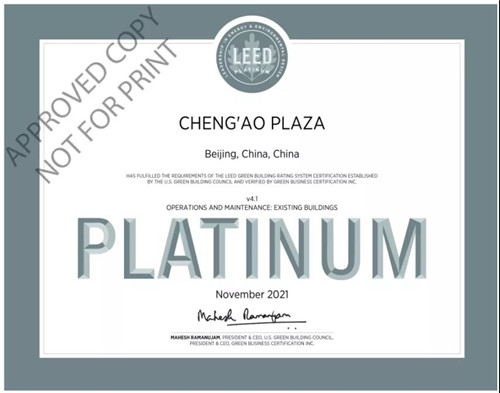 2021年11月,城奧大廈獲得LEED O+M鉑金級認證。這是城奧大廈繼榮獲綠建三星認證后取得的又一國際性綠色建筑認證。