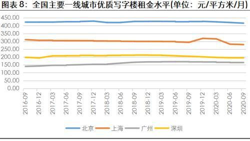 寫字樓空置率方面,2017年以來,一線城市中,廣州近年來寫字樓新增供應(yīng)增長(zhǎng)較為平穩(wěn),有限供應(yīng)下有利于去化,優(yōu)質(zhì)寫字樓空置率一直處于較低水平。深圳累計(jì)新增寫字樓供應(yīng)面積一直位居一線城市之首,優(yōu)質(zhì)寫字樓供過于求特征凸顯,受此影響,近年來空置率大幅提高。其余一線城市優(yōu)質(zhì)寫字樓空置率整體呈增長(zhǎng)趨勢(shì),但明顯好于二線城市。2020年以來,受新冠疫情影響,部分行業(yè)尚未恢復(fù)到疫情前水平,重點(diǎn)城市寫字樓租賃需求仍然疲軟,空置率較2019年末有所上升。2020年9月末,北京、上海、廣州和深圳優(yōu)質(zhì)寫字樓空置率分別較2019年末上升3.9%、1.0%、2.4%和0.1%,至17.70%、20.40%、7.80%和20.10%。一線城市中,上海及深圳優(yōu)質(zhì)寫字樓空置率均已超過20%,寫字樓空置風(fēng)險(xiǎn)值得關(guān)注。