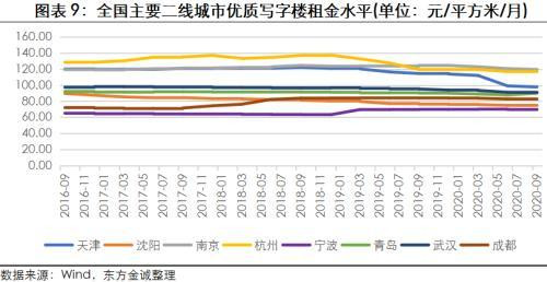 二線城市方面,2017年以來,南京和青島優(yōu)質(zhì)寫字樓的空置率增長(zhǎng)較快,但整體來看,長(zhǎng)三角區(qū)域的南京、杭州及寧波空置率仍處于較低水平,天津、武漢及重慶優(yōu)質(zhì)寫字樓空置率持續(xù)高企。2020年9月末,二線重點(diǎn)城市中,南京寫字樓空置率仍最低為17.00%,最高為天津的44.70%。2017年以來,受新增寫字樓供給較大、區(qū)域經(jīng)濟(jì)增長(zhǎng)放緩等因素影響,天津優(yōu)質(zhì)寫字樓空置率持續(xù)處于高位;此外,武漢、重慶優(yōu)質(zhì)寫字樓空置率近三年也均在30.00%以上。