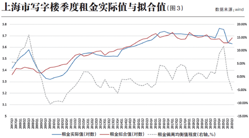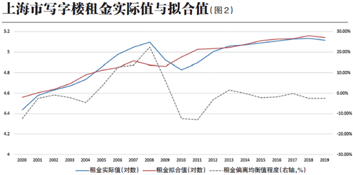 寫字樓租金有一定自我調(diào)整機制,其會對其上年偏離均衡值大。P椭蠩CM項)進行調(diào)整。如果上一期寫字樓租金過高,本期租金增長率會下調(diào)。