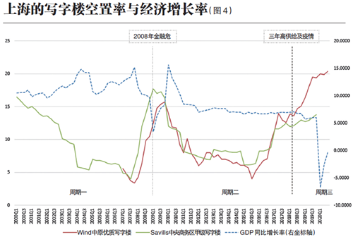 上海的寫字樓空置率在近年上升主要由于經(jīng)濟發(fā)展放緩背景下,階段性高供給的寫字樓無法被市場吸收;2020年新冠疫情使得經(jīng)濟增長短暫停滯,空置率進一步攀升(如圖4)。