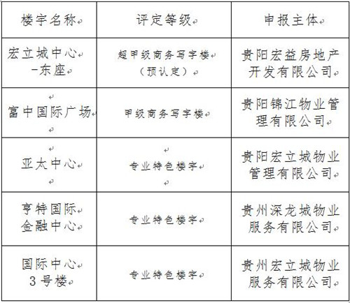 房訊網(wǎng)訊 近日,2021年貴陽首批商務(wù)樓宇評(píng)定達(dá)標(biāo)樓宇評(píng)審結(jié)果進(jìn)入公示。此次商務(wù)樓宇等級(jí)評(píng)定中,南明區(qū)共有12棟商務(wù)寫字樓申報(bào)參評(píng)。經(jīng)資格預(yù)審、書面評(píng)審、現(xiàn)場(chǎng)測(cè)評(píng)、暗訪及滿意度調(diào)查等環(huán)節(jié),今年3月13日完成首次評(píng)定工作各項(xiàng)流程,根據(jù)兩項(xiàng)團(tuán)體標(biāo)準(zhǔn),其中5棟商務(wù)樓宇分別達(dá)到相應(yīng)認(rèn)定標(biāo)準(zhǔn)。