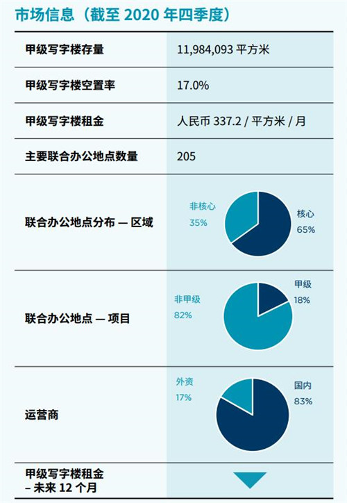 從北京聯(lián)合辦公的市場分布來看,截止至2020年四季度,核心商圈的布點(diǎn)已經(jīng)從2018年初的57%上升至65%,所在項(xiàng)目的物業(yè)類型也從傳統(tǒng)寫字樓向多樣化發(fā)展。截至2020年末,北京聯(lián)合辦公布點(diǎn)除傳統(tǒng)的甲乙級(jí)寫字樓外,還包括一些商務(wù)園區(qū)、零售及城市更新類的改造項(xiàng)目等,其中乙級(jí)寫字樓占比繼續(xù)領(lǐng)跑,高達(dá)60%。