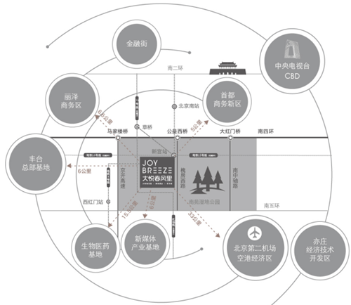 商圈的發(fā)展一般會(huì)沿著交通線和居民分布進(jìn)行延伸,北京的國貿(mào)商圈位于三環(huán)與長安街交匯區(qū),望京商圈也承接國門樞紐的便利。交通會(huì)促進(jìn)商業(yè)的集聚形成規(guī)模經(jīng)濟(jì),規(guī)模效應(yīng)不僅能夠提高自身影響力,增強(qiáng)抗風(fēng)險(xiǎn)能力,吸引越來越多的消費(fèi)者和經(jīng)營者寄居于此,還可以共享基礎(chǔ)設(shè)施和市場(chǎng)信息,降低運(yùn)營成本,實(shí)現(xiàn)商圈內(nèi)的資源共享。大悅時(shí)代中心站位城市南四環(huán)與南中軸交匯的黃金區(qū)位,并坐擁城市唯一的四軌地鐵新宮站,同時(shí)南站、西站、新豐臺(tái)站等城際樞紐均在20分鐘車程內(nèi),是城市向南發(fā)展必拓的咽喉門戶區(qū),因此為商圈的形成奠定基礎(chǔ)保障。