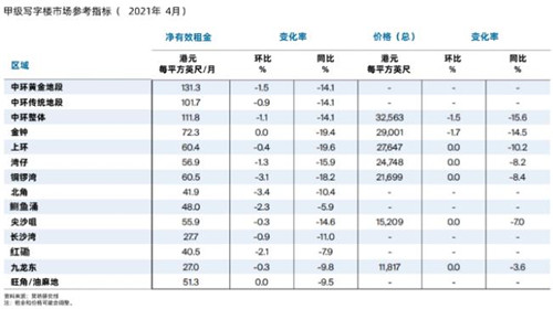 中環(huán)核心區(qū)甲級寫字樓的空置率在四月份沒有進(jìn)一步攀升,維持7.9%,情況和三月份相似。不過,非核心商業(yè)區(qū)的空置寫字樓在本月繼續(xù)上升,灣仔及銅鑼灣的空置率則上升至12.4%及7.5%。