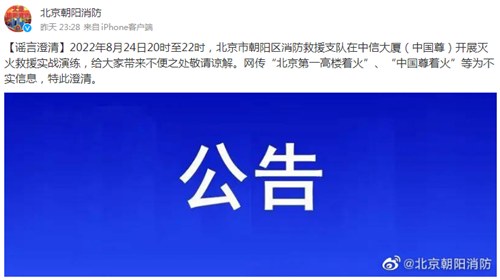 2022年8月24日20時(shí)至22時(shí),北京市朝陽區(qū)消防救援支隊(duì)在中信大廈(中國(guó)尊)開展滅火救援實(shí)戰(zhàn)演練,給大家?guī)聿槐阒幘凑?qǐng)諒解。網(wǎng)傳“北京第一高樓著火”、“中國(guó)尊著火”等為不實(shí)信息,特此澄清。