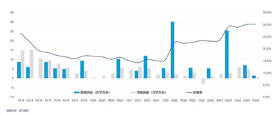 全市空置率環(huán)比上升0.1個(gè)百分點(diǎn),至30.2%,同比上漲6.6%,市場空置壓力較大;由于項(xiàng)目延期,年底的空置率將有所回落,但2025年的預(yù)估空置率將進(jìn)一步上升。