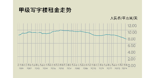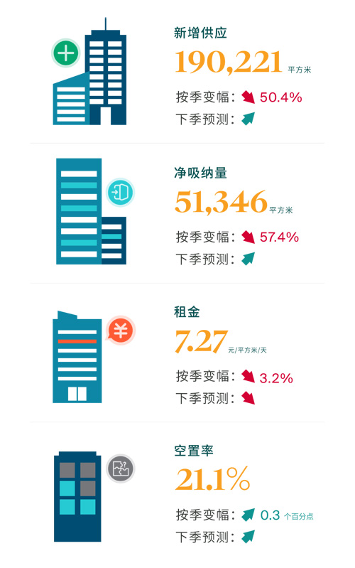 第三季度,全市甲級(jí)寫字樓的平均租金繼續(xù)環(huán)比下跌3.2%至每天每平方米人民幣7.27元。由于企業(yè)希望降低租賃成本,核心商務(wù)區(qū)和中央商務(wù)區(qū)的企業(yè)紛紛選擇外遷;與此同時(shí),業(yè)主為降低市場(chǎng)空置率,繼續(xù)下調(diào)租金,導(dǎo)致這兩個(gè)區(qū)域的市場(chǎng)租金分別環(huán)比下跌3.6%和3.5%。其中,核心商務(wù)區(qū)的市場(chǎng)租金跌破10元,降至每天每平方米人民幣9.94元,創(chuàng)下近期的租金新低。新興商務(wù)區(qū)及中央商務(wù)區(qū)擴(kuò)展區(qū)的寫字樓市場(chǎng)租金在本季度仍然保持下跌趨勢(shì),但平均租金的環(huán)比跌幅有所收窄,均下跌1.9%,較上一季度的平均三個(gè)點(diǎn)以上跌幅有顯著減小。