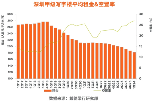 一季度,深圳共有16.2萬平方米的甲級寫字樓投入使用。在新供應(yīng)的影響下,本季度全市凈吸納量錄得45,344平方米,環(huán)比上升5.4%;空置率則微升至27.0%。連續(xù)多年的高供應(yīng)加上整體市場新增需求走弱,市場去化持續(xù)承壓。租戶市場下,全市平均租金水平繼續(xù)回調(diào)至每月每平方米181.8元。
