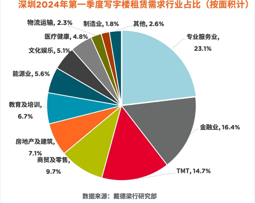 在企業(yè)“降本增效”的目標(biāo)下,租賃需求以搬遷及續(xù)租為主。專業(yè)服務(wù)、金融業(yè)及TMT的占比分別為23.1%、16.4%及14.7%,其中,律所、戰(zhàn)略咨詢、證券、險資等行業(yè)均有大面積成交。TMT類需求表現(xiàn)分化,游戲、電商有擴(kuò)張動作;另外來自零售貿(mào)易、以及留學(xué)中介、教培、醫(yī)美等行業(yè)亦較為活躍,以小面積租賃居多。