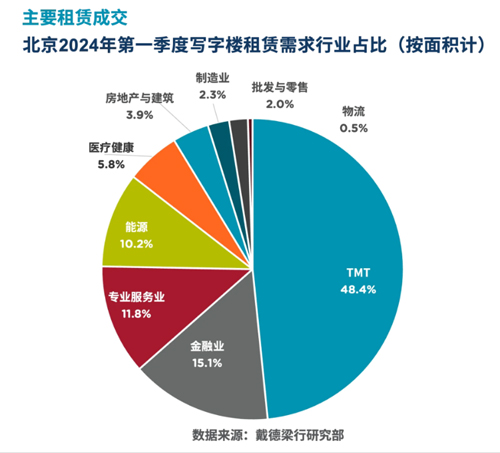 一季度,隨著北京數(shù)字經(jīng)濟(jì)的快速發(fā)展,TMT行業(yè)成交面積約占所有行業(yè)總成交面積的一半,為48.4%。其次為金融業(yè)和專業(yè)服務(wù)業(yè),分別占所有行業(yè)總成交面積的15.1%和11.8%。能源行業(yè)則延續(xù)2023年的強(qiáng)勁勢(shì)頭,位居第四位,占所有行業(yè)總成交面積的10.2%。