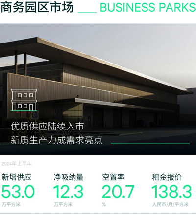 2024年上半年上海商務(wù)園區(qū)寫字樓市場(chǎng)迎來八個(gè)新增供應(yīng),集中在張江和金橋板塊,以及臨空和市北,共計(jì)53萬平方米,同比上升53%。二季度市場(chǎng)有所回暖,季度凈吸納量環(huán)比上升至7.6萬平方米,至此上半年累計(jì)凈吸納量12.3萬平方米,同比上升57%。集中供應(yīng)推動(dòng)當(dāng)前空置率至20.7%,同比上行2.7個(gè)百分點(diǎn)。
