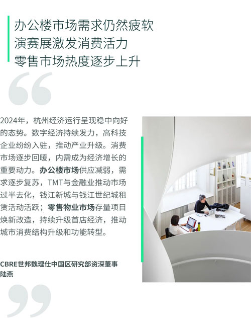 在其他方面,內(nèi)資租戶依然是杭州市場(chǎng)需求的主導(dǎo)力量,而外資租戶的新增需求相對(duì)較少且面積較小,占比已降至6%。在租賃需求的面積分布中,500平方米以下的小面積需求仍占據(jù)主導(dǎo)地位,達(dá)到51%。全市新設(shè)企業(yè)占比15%,而搬遷類需求則超過(guò)一半。盡管市場(chǎng)表現(xiàn)出一定的活躍度,但全年新設(shè)企業(yè)數(shù)量依然較少,且大多為小面積租賃。其原因一方面在于經(jīng)濟(jì)增速放緩,導(dǎo)致企業(yè)在擴(kuò)張時(shí)更加謹(jǐn)慎;另一方面,今年企業(yè)的主要目標(biāo)是降本增效,進(jìn)一步抑制了新租賃需求。因此,全年的凈吸納量低于10萬(wàn)平方米,低于過(guò)去五年平均的29萬(wàn)平方米,顯示出市場(chǎng)在當(dāng)前整體環(huán)境下的謹(jǐn)慎態(tài)度。