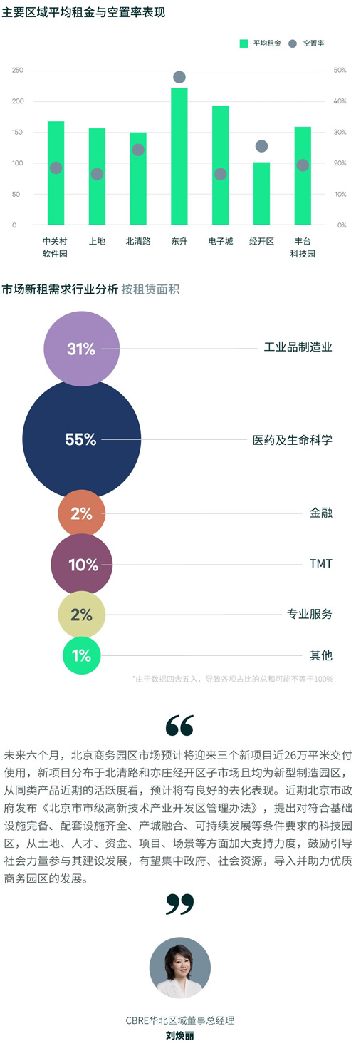 2025年第一季度,北京商務(wù)園區(qū)市場(chǎng)迎來新增供應(yīng)小高峰,錄得五個(gè)新項(xiàng)目共計(jì)體量48.2萬平方米交付使用,其中三個(gè)為具有“研發(fā)、中試、生產(chǎn)”一體化功能的新型制造園區(qū),吸引了眾多有成果轉(zhuǎn)化需求的企業(yè)入駐,且多為萬平方米以上整棟租賃需求,入市后即有共18.8萬平方米面積去化,成為本季度整體凈吸納量的貢獻(xiàn)主力。此外,定向?yàn)獒t(yī)藥及生命科學(xué)產(chǎn)業(yè)設(shè)計(jì)的專項(xiàng)園區(qū)占總新增面積的86%,創(chuàng)該板塊單季新增供應(yīng)量歷史紀(jì)錄。