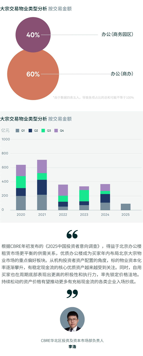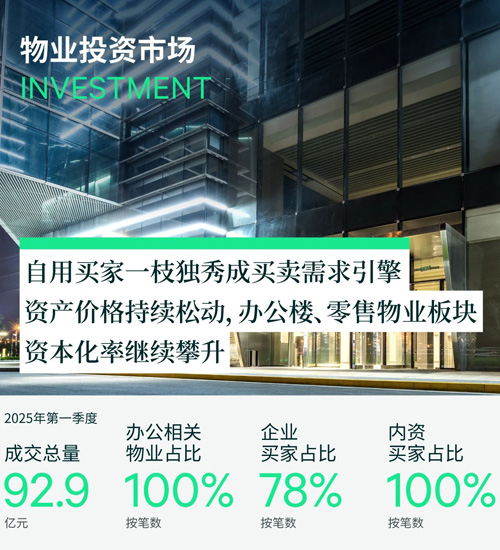 2025年第一季度,北京物業(yè)投資市場(chǎng)活躍度仍略顯溫和,一共錄得9筆交易,累計(jì)交易總額92.9億元,環(huán)比、同比分別下降4.8%和14.7%。