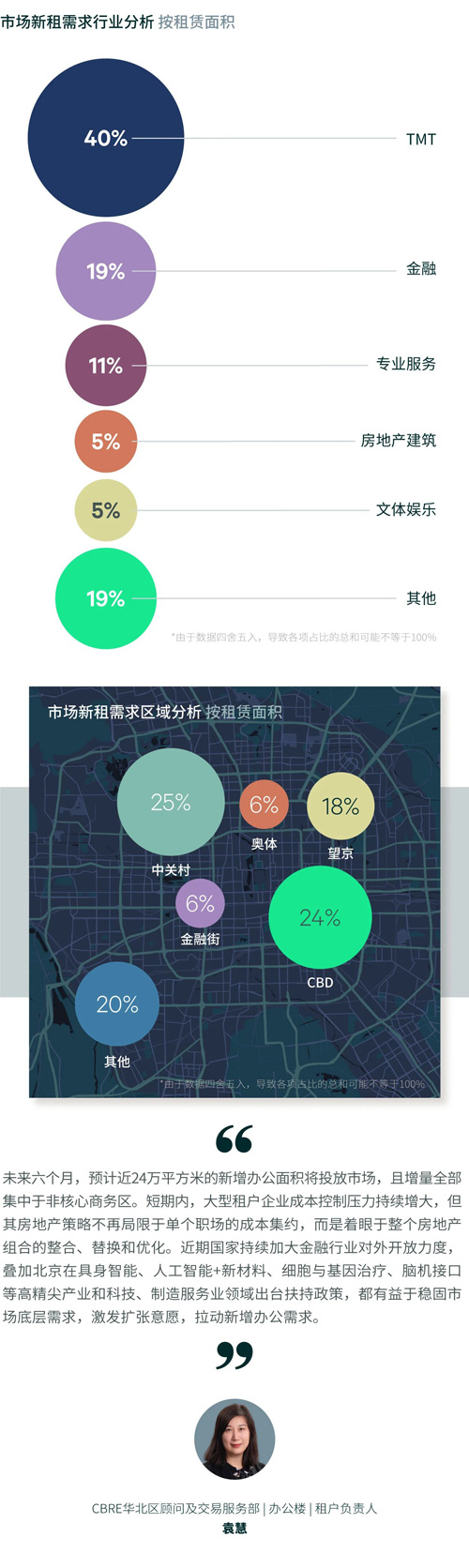 春節(jié)過后,市場(chǎng)情緒有所回暖,問詢量與帶看量逐步攀升。本季度全市新租交易總面積超過2023年和2024年同期水平。搬遷依舊是新租活動(dòng)的主要構(gòu)成部分,占新租交易總面積的近八成。在頭部TMT企業(yè)的帶動(dòng)下,擴(kuò)租需求數(shù)量和面積占比均出現(xiàn)回升。從行業(yè)維度分析,TMT行業(yè)的人工智能、大數(shù)據(jù)和平臺(tái)互聯(lián)網(wǎng)等賽道持續(xù)發(fā)力,占據(jù)新租需求首位,季內(nèi)錄得多筆萬平方米以上的擴(kuò)租及整合升級(jí)的搬遷交易。金融行業(yè)的基金和保險(xiǎn)類租戶呈現(xiàn)小面積擴(kuò)租現(xiàn)象。專業(yè)服務(wù)業(yè)的新租需求位列第三,內(nèi)資律所、咨詢類租戶搬遷或擴(kuò)租需求逐步釋放。房地產(chǎn)板塊的新租需求上升至第四位。