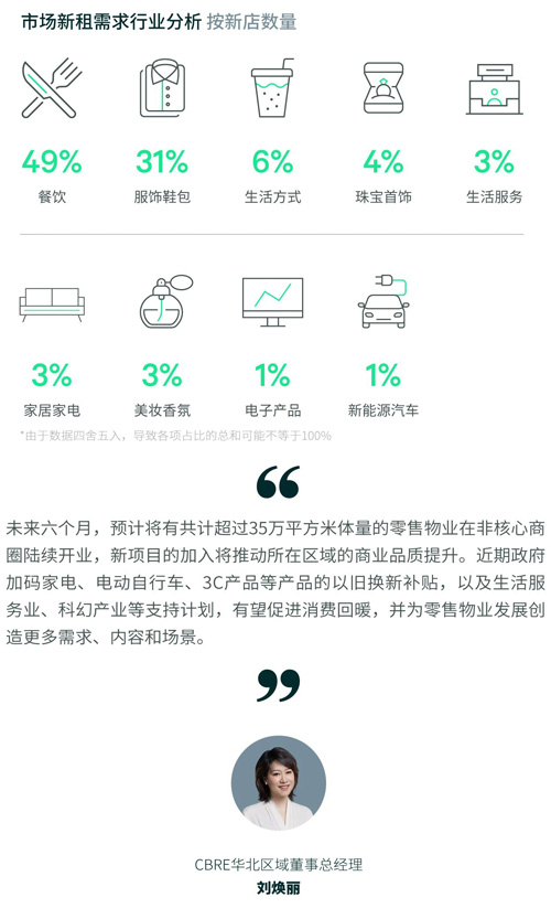 北京1-2月社銷總額同比微降0.1%,其中餐飲收入下降4.1%,商品零售增長(zhǎng)0.3%,較去年全年數(shù)字均有改善,但仍低于去年同期水平,消費(fèi)回暖仍不明朗。反映在拓店需求上,本季度餐飲新增店鋪占比49%,較上季度有小幅回落,主要原因?yàn)橹懈叨瞬惋嫎I(yè)態(tài)擴(kuò)張步伐略有放緩,而小吃快餐(如濱壽司、肉肉大米)、烘焙甜品(如倫敦烘焙小鎮(zhèn)、宿咕)及茶飲果汁類(如本就茶飲、爺爺不泡茶)消費(fèi)仍舊占據(jù)主流,并保持穩(wěn)定的拓店速度。零售方面,奢侈品類調(diào)整線下布局,關(guān)閉低效門店,季內(nèi)在CBD、王府井等核心商圈均錄得閉店。運(yùn)動(dòng)戶外品牌(如胡丁尼、布魯克斯)在全城多點(diǎn)開花,帶動(dòng)服飾鞋包新開店鋪數(shù)量占比環(huán)比小幅提升至31%。珠寶首飾類開鋪亦持續(xù)活躍,而美容、保健類等生活服務(wù)類熱度有所減弱。核心商圈品牌更迭更加活躍、業(yè)主為品牌提供更多優(yōu)質(zhì)的鋪位選擇,新開店鋪核心商圈占全市比環(huán)比大幅提升。與此同時(shí),個(gè)別面對(duì)消費(fèi)格局的轉(zhuǎn)變而未能及時(shí)調(diào)整自身運(yùn)營(yíng)策略的老牌項(xiàng)目持續(xù)流失品牌客戶,導(dǎo)致季內(nèi)凈吸納量錄得負(fù)值,空置率環(huán)比上漲0.1個(gè)百分點(diǎn)至7.4%。