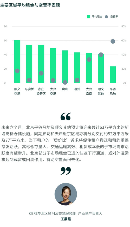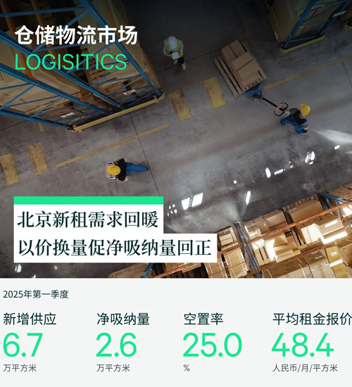 2025年第一季度,北京平谷馬坊交付一個(gè)倉儲(chǔ)物流項(xiàng)目,帶來6.7萬平方米新增供應(yīng)。以供應(yīng)鏈及合同物流企業(yè)為代表的第三方物流占季末總新租面積的60%,而純電商及制造業(yè)需求有小幅回升,帶動(dòng)季內(nèi)凈吸納量在歷經(jīng)連續(xù)四個(gè)季度的負(fù)值后首次回正錄得2.6萬平方米。市場(chǎng)新租需求有所回暖,季內(nèi)錄得數(shù)個(gè)來自電商或制造業(yè)超過萬平方米的大面積擴(kuò)增,但租戶整合、縮減、降級(jí)活動(dòng)也在同步出現(xiàn)。在租戶降本增效策略的導(dǎo)向下,項(xiàng)目間表現(xiàn)逐步分化,核心區(qū)位、樓齡較新且率先增加租金靈活性的項(xiàng)目更受歡迎,反之則有較大的客戶流失風(fēng)險(xiǎn)。全市空置率環(huán)比上漲0.6個(gè)百分點(diǎn)至25.0%,空置面積主要來自順義空港和平谷馬坊。
