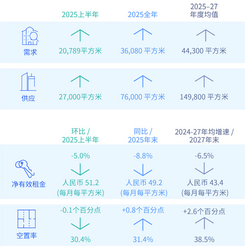 2025年上半年,沈陽寫字樓市場凈吸納量較去年有所提升,但市場去化主要由新增供應(yīng)項目的預(yù)租貢獻,存量項目的去化速度相對較緩。當(dāng)前較高的空置率水平,加上未來新項目的入市,市場供需關(guān)系的調(diào)整將需要一定時間。預(yù)計短期內(nèi)租金水平仍將面臨一定的下行壓力。