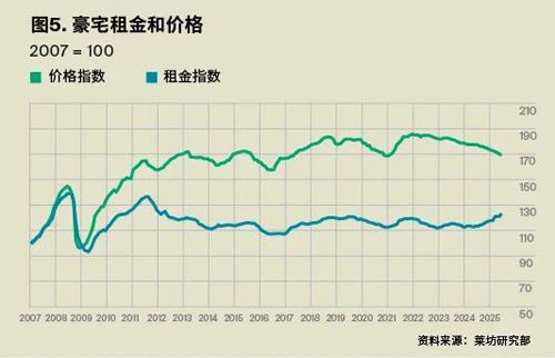在新盤方面,黃竹坑及馬鞍山為成交最活躍地區(qū),其中Sierra(1B期)及深水灣滶晨銷售強勁。第二季豪宅市場錄得54宗金額超過港幣7,800萬的成交,按季上升29%。豪宅租賃市場表現(xiàn)向好,在非本地專業(yè)人士和學生需求的推動下,2025年5月錄得租金按月上升0.7%,年初至今增加1.4%。值得注意來自非金融部門的外籍人士增加。展望今年第三季,年輕專業(yè)人士的租賃活動亦有望增加,特別是從英國和新加坡搬遷來港尋求工作機會的專業(yè)人士。