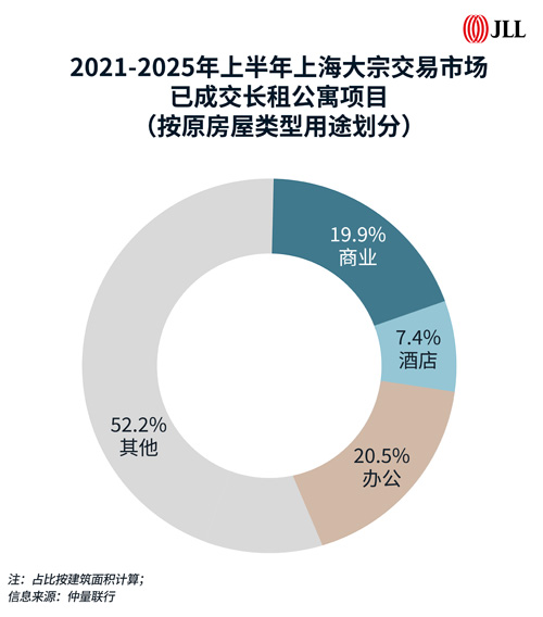 仲量聯(lián)行數(shù)據(jù)顯示,根據(jù)成交建筑面積計(jì)算,2021年至2025年上半年,上海大宗交易市場(chǎng)已成交長(zhǎng)租公寓項(xiàng)目中,原有用途為辦公樓、商業(yè)和酒店的項(xiàng)目分別占比20.5%、19.9%和7.4%。上!吧谈淖 毙抡耐瞥觯瑹o(wú)疑將進(jìn)一步推動(dòng)老舊、低效的存量商辦資產(chǎn)轉(zhuǎn)化為當(dāng)下更符合租住需求的功能業(yè)態(tài)。