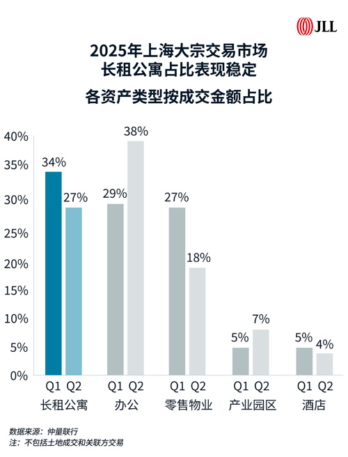 盡管2025年上海大宗交易市場(chǎng)面臨挑戰(zhàn),長(zhǎng)租公寓板塊卻表現(xiàn)亮眼。截至8月,該資產(chǎn)類別的成交金額已達(dá)71億元,接近2024年全年總額(77億元)。尤其在第一季度,長(zhǎng)租公寓以34%的成交金額占比位居市場(chǎng)第一,第二季度以27%的占比占據(jù)第二,顯示出極強(qiáng)的資產(chǎn)韌性和資本吸引力。