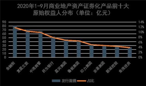從原始權益人來看,2020年1-9月發(fā)行規(guī)模位居第一的是金融街發(fā)行的“金融街中心資產(chǎn)支持專項計劃”,發(fā)行規(guī)模80億元,占總規(guī)模的11.76%;發(fā)行利率2.8%,低于平均利率水平。