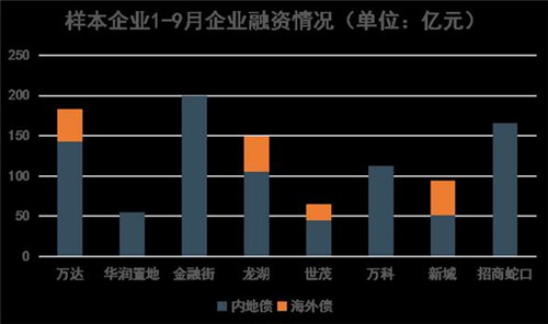 從更廣的金融動作來看,以8家商業(yè)地產(chǎn)龍頭企業(yè)為樣本,統(tǒng)計包含公司債、中期票據(jù)、資產(chǎn)支持證券、海外債等融資方式,可以發(fā)現(xiàn)1-9月有兩個融資高峰期。