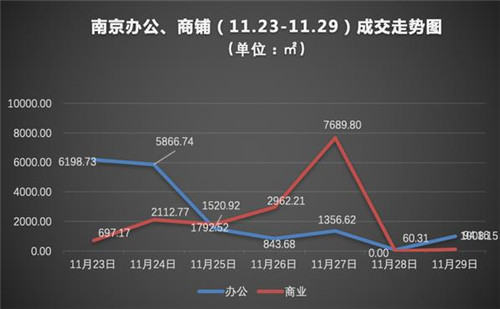 統(tǒng)計(jì)周期內(nèi),辦公和商鋪的成交量均有大幅上漲,辦公銷量總體呈下降趨勢,商鋪銷量在11月27日達(dá)到頂峰。從板塊分布來看,本周辦公成交量前三名為雨花臺(tái)區(qū)、建鄴區(qū)和鼓樓區(qū)。商鋪方面,本周浦口區(qū)的成交量領(lǐng)跑全市,其次是江寧區(qū)和鼓樓區(qū)。