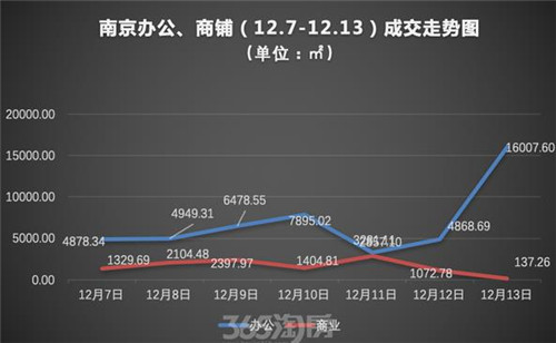 據(jù)南京網(wǎng)上房地產(chǎn)數(shù)據(jù),南京樓市上周(12月7日-12月13日)商業(yè)地產(chǎn)銷售市場共成交面積59662.71㎡,環(huán)比上漲42.91%。其中辦公類產(chǎn)品成交48358.62㎡,環(huán)比上漲242.95%,商鋪類產(chǎn)品成交11304.09㎡,環(huán)比下跌59.11%。