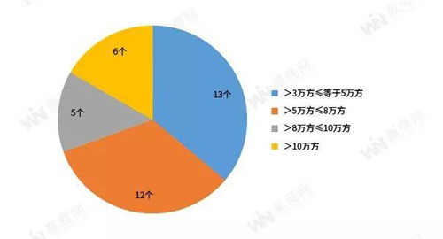 2019年上海開業(yè)的36個購物中心中,商業(yè)面積在3-5萬方以內的購物中心共13個,占一年總開業(yè)量的36.11%,5-8萬方的購物中心有12個,占比約33.33%,8-10萬方的購物中心有5個,超過10萬方的購物中心為6個。