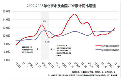 天災(zāi)、疾病、戰(zhàn)亂等獨(dú)立社會(huì)事件在所有經(jīng)濟(jì)預(yù)測(cè)模型中被視作外生變量,它具有突然性、偶然性、不可預(yù)測(cè)性的特征。這一次的疫情也正是這樣的一宗“黑天鵝”事件,并已開始對(duì)經(jīng)濟(jì)和生活產(chǎn)生重大影響。對(duì)于剛剛經(jīng)歷了2019年的壓力和挑戰(zhàn)的北京市場(chǎng),不少辦公樓業(yè)主直呼此次新冠疫情使得市場(chǎng)形勢(shì)“雪上加霜”。此次研究,我們首先將著重分析北京市非典時(shí)期的經(jīng)濟(jì)市場(chǎng)情況,并與本市當(dāng)前環(huán)境進(jìn)行對(duì)比,隨后對(duì)北京辦公樓市場(chǎng)需求行業(yè)進(jìn)行針對(duì)性研究,最后將闡釋對(duì)業(yè)主所進(jìn)行的訪談?wù){(diào)查,希望對(duì)各位作出市場(chǎng)研判有一定幫助。