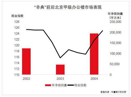 具體到辦公樓市場(chǎng),非典時(shí)期的北京市場(chǎng)僅受到短期影響。甲級(jí)辦公樓市場(chǎng)租金在2003 年2- 3 季度分別環(huán)比下降3%和4%,而2003 年全年租金水平僅同比下降6%。若排除新項(xiàng)目低價(jià)入市等其他影響因素,非典疫情對(duì)辦公樓市場(chǎng)租金的短期影響僅為-2%左右。隨著疫情得到有效控制,全市租金水平旋即回調(diào),2004 年北京甲級(jí)辦公樓市場(chǎng)租金即錄得同比11.2%的高速增長(zhǎng)。雖然市場(chǎng)空置率并未因疫情影響表現(xiàn)出明顯變化,但全市租賃活躍度大幅下降,2003 年北京甲級(jí)辦公樓凈吸納量?jī)H4.7 萬(wàn)平方米,僅為去年同期的37%,是2004 年的24%。