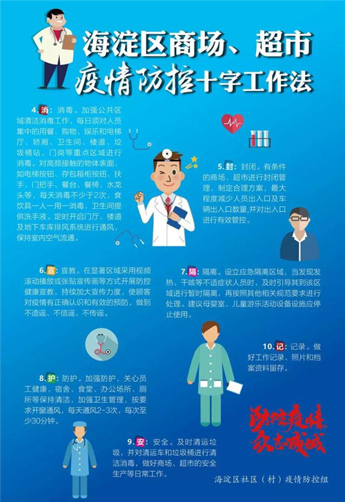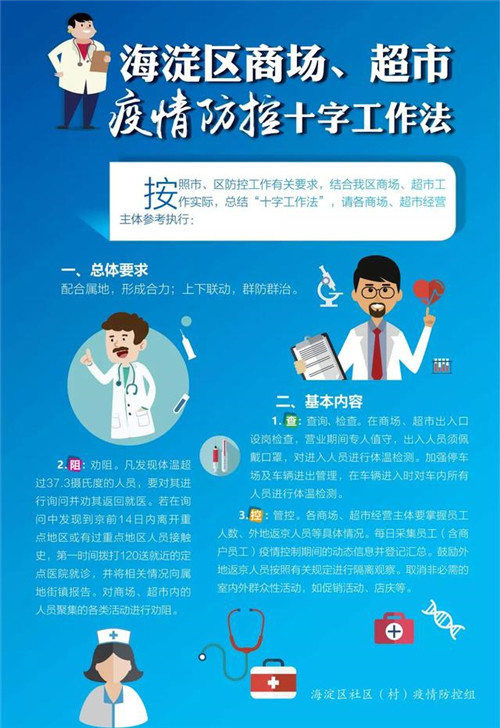 按照市、區(qū)防控工作有關(guān)要求,結(jié)合海淀區(qū)商場、超市工作實際,總結(jié)“十字工作法”,請各商場、超市經(jīng)營主體參考執(zhí)行: