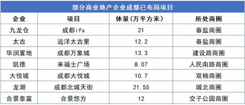 截止目前,不少知名商業(yè)地產(chǎn)企業(yè)都在成都進行了商業(yè)體的布局,包括港資代表九龍倉、太古;內(nèi)資代表華潤、大悅城、龍湖、萬達,以及外資代表凱德等。