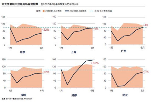 自五月來發(fā)布多地消費(fèi)提振政策,以及五一、端午小長假刺激,多地頂級商場業(yè)績回暖。我們以全國六座城市的標(biāo)桿型奢侈品商場為樣本,以近24個月商場的月均客流為常態(tài)基準(zhǔn)值100,來衡量高端商場客流復(fù)蘇狀況。結(jié)果顯示,頂級商場客流在二月大幅下滑后,經(jīng)歷多月回升,在六月已回歸至均值水準(zhǔn)。各主要城市高端市場的回暖程度也存在差異,成都回暖力度令人矚目,廣州在六月突破歷史均值,上海較均值僅有微小差距,而武漢客流已恢復(fù)到89%,預(yù)計在未來兩個月將超均值。
