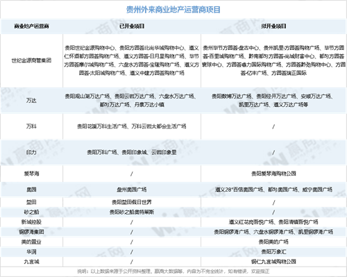 目前在商業(yè)地產(chǎn)市場上有成熟商業(yè)運(yùn)營體系、操盤過眾多備具影響力的項(xiàng)目、并有縱深發(fā)展趨勢的外來商業(yè)運(yùn)營商,均在貴州布局有商業(yè)項(xiàng)目,包括印力、萬達(dá)、世紀(jì)金源、愛琴海、益田、萬達(dá)、奧園等。這些企業(yè)在貴州布局的項(xiàng)目不僅為市場帶來了眾多不一樣的消費(fèi)理念和新鮮內(nèi)容,也占據(jù)了消費(fèi)市場很大一部分消費(fèi)份額。