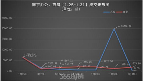 據(jù)南京網(wǎng)上房地產(chǎn)數(shù)據(jù),南京樓市上周(1月25日-1月31日)商業(yè)地產(chǎn)銷售市場共成交面積44598.93㎡,環(huán)比猛增204.93%。其中辦公類產(chǎn)品成交29143.89㎡,環(huán)比暴漲483.06%,商鋪類產(chǎn)品成交15455.04㎡,環(huán)比上漲60.53%。