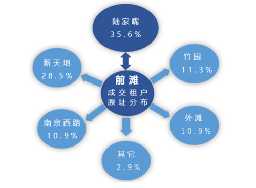 前灘商務(wù)區(qū)在2020年表現(xiàn)亮眼,不僅局限于新設(shè)企業(yè)租戶(hù),對(duì)其他傳統(tǒng)商務(wù)區(qū)的吸附效應(yīng)也較為明顯,全年上海大面積(≥8000㎡)成交租戶(hù)中,前灘商務(wù)區(qū)占比近一半。