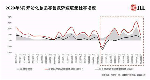 生在一個(gè)“顏值即正義”的看臉時(shí)代,雖然在去年初,居家隔離和出門戴口罩等政策和口罩讓化妝成為了“非必要活動(dòng)”。但國內(nèi)疫情趨緩后,化妝品零售額的反彈速度從3月開始就超過了社會(huì)消費(fèi)品零售總額的增速。