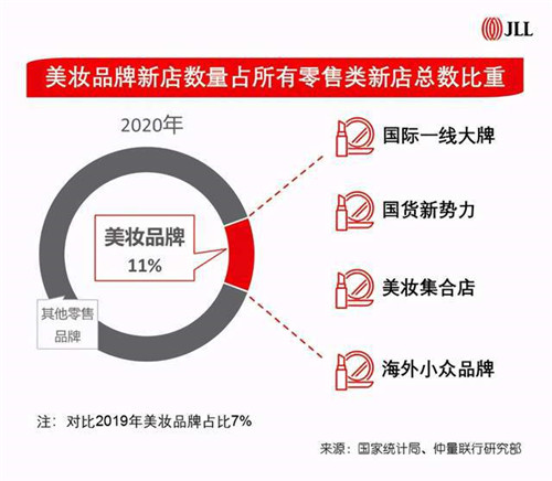 在仲量聯(lián)行追蹤觀察的100家上海優(yōu)質(zhì)購物中心中,2020年美妝品牌新店數(shù)量占所有零售類新店總數(shù)比重約11%,較19年同比提升4個(gè)百分點(diǎn)。這背后的原因不言自明:對(duì)于年輕消費(fèi)者來說,化妝品消費(fèi)等同于剛需消費(fèi),是日常生活中必不可少的投入。
