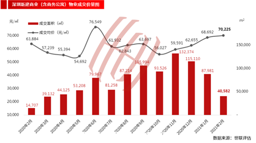一手商業(yè)物業(yè)均價為70,225元/㎡,環(huán)比上漲2.2%。2月份為傳統(tǒng)淡季,成交面積僅40,582平方米,環(huán)比下跌53.9%。3月開始,商務公寓成交量將會逐漸恢復。
