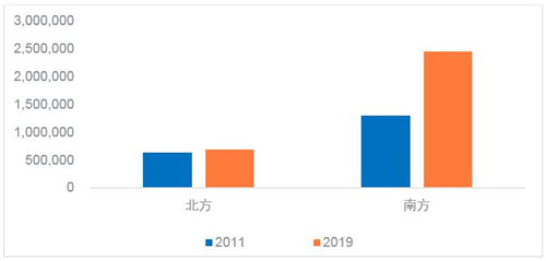 2015年至今,北方經(jīng)濟對全國經(jīng)濟的貢獻率逐年下滑,從2015年的43.2%下降至2019年的35.4%,降幅高達7.8個百分點。2019年,南方省份GDP平均增幅為7.1%,較北方省份高出1.4個百分點。在社會消費品零售額方面,2010至2019年,南方省份的社消總額增長迅猛,平均增幅為230%,而北方的平均增幅僅為117.7%。