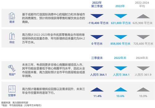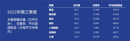 本季,受到成都疫情反彈及限電等影響,致使八九月市場(chǎng)活動(dòng)放緩,幾近暫停,市場(chǎng)需求減弱,當(dāng)季凈吸納量錄得約-11.8萬(wàn)平方米。同時(shí),待入市項(xiàng)目工期日程等方面受阻,年底新項(xiàng)目普遍延期,當(dāng)季未錄得新增供應(yīng)。全市空置率環(huán)比上升1.3個(gè)百分點(diǎn)至11.4%。全市平均首層租金環(huán)比下降0.3%至364.1元每平方米每月。