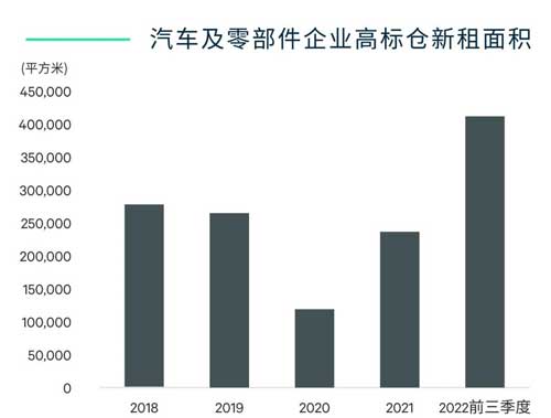 行業(yè)的高速發(fā)展催生了大量的倉(cāng)儲(chǔ)需求。根據(jù)我們的統(tǒng)計(jì)數(shù)據(jù),前三季度汽車及零部件企業(yè)的高標(biāo)倉(cāng)新租面積超過(guò)40萬(wàn)平方米,較2021年全年值增長(zhǎng)超過(guò)70%且創(chuàng)歷史新高。上海、廣州、重慶、天津、佛山、寧波、廊坊等汽車產(chǎn)業(yè)集聚城市均錄得大面積租賃。