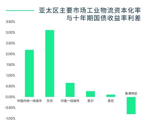 此外,中國(guó)央行今年以來(lái)的持續(xù)降息并由此與其他主要經(jīng)濟(jì)體形成的利率周期錯(cuò)位令國(guó)內(nèi)物流資產(chǎn)的定價(jià)具備相對(duì)的吸引力。我們對(duì)亞太區(qū)主要市場(chǎng)物流設(shè)施資本化率和十年期國(guó)債收益率的分析顯示,目前中國(guó)一線城市高標(biāo)倉(cāng)的平均資本化率水平為4.9%,與十年期國(guó)債收益率的利差約220個(gè)基點(diǎn),小于東京,但顯著高于其他主要市場(chǎng)。
