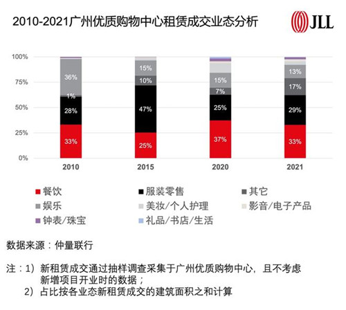對(duì)于零售地產(chǎn)業(yè)主和品牌商來(lái)說(shuō),在消費(fèi)市場(chǎng)持續(xù)發(fā)展,消費(fèi)結(jié)構(gòu)不斷升級(jí)的背景下,哪些業(yè)態(tài)最具增長(zhǎng)潛力,如何匯聚優(yōu)質(zhì)資源,從而吸引目標(biāo)人群是每天都要面對(duì)的重要課題。對(duì)此,仲量聯(lián)行華南區(qū)研究部總監(jiān)曾麗表示:“我們歷年所追蹤新增租賃成交數(shù)據(jù)顯示出,服飾零售、餐飲、娛樂(lè)三大業(yè)態(tài)10年來(lái)始終是廣州存量?jī)?yōu)質(zhì)購(gòu)物中心內(nèi)的主角,占比達(dá)到70%以上。但消費(fèi)人口、行業(yè)發(fā)展、市場(chǎng)環(huán)境以及消費(fèi)習(xí)慣變化等因素,也讓這三大業(yè)態(tài)各自占比發(fā)生變化,品牌多元化、細(xì)分化日趨明顯,需要零售地產(chǎn)市場(chǎng)參與各方給予充分關(guān)注!