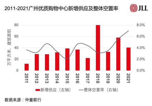 雖然社會(huì)消費(fèi)品零售總額增速喜人,但廣州優(yōu)質(zhì)零售物業(yè)市場(chǎng)的“量”和“質(zhì)”發(fā)展卻未能及時(shí)跟上。過(guò)去兩年,廣州優(yōu)質(zhì)購(gòu)物中心的新增供應(yīng)落后于其他一線及新一線城市。更重要的是,消費(fèi)的回暖并沒(méi)有帶動(dòng)整個(gè)零售物業(yè)市場(chǎng)的恢復(fù),市場(chǎng)分化加劇,不少老項(xiàng)目的空置率一路走高。