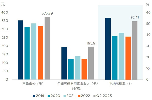 從經(jīng)營(yíng)指標(biāo)上來(lái)看, 2023年二季度中國(guó)星級(jí)酒店平均房?jī)r(jià)已經(jīng)超過(guò)疫情前的標(biāo)準(zhǔn),達(dá)到373.79元。同時(shí),每間可供出租客房收入也由2022年的122.14(元/間夜)提升到195.9(元/間夜),已超過(guò)2019年水平。最后,平均出租率方面情況相同,相較于2022年的38.35%,今年二季度出租率增長(zhǎng)至52.41%(圖2)。