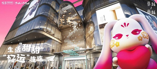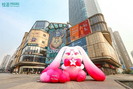 重慶悅薈1/3號門廣場外5米高的聯(lián)名IP定制兔,既是IP形象的抓取,又是新年兔年形象的昭示;